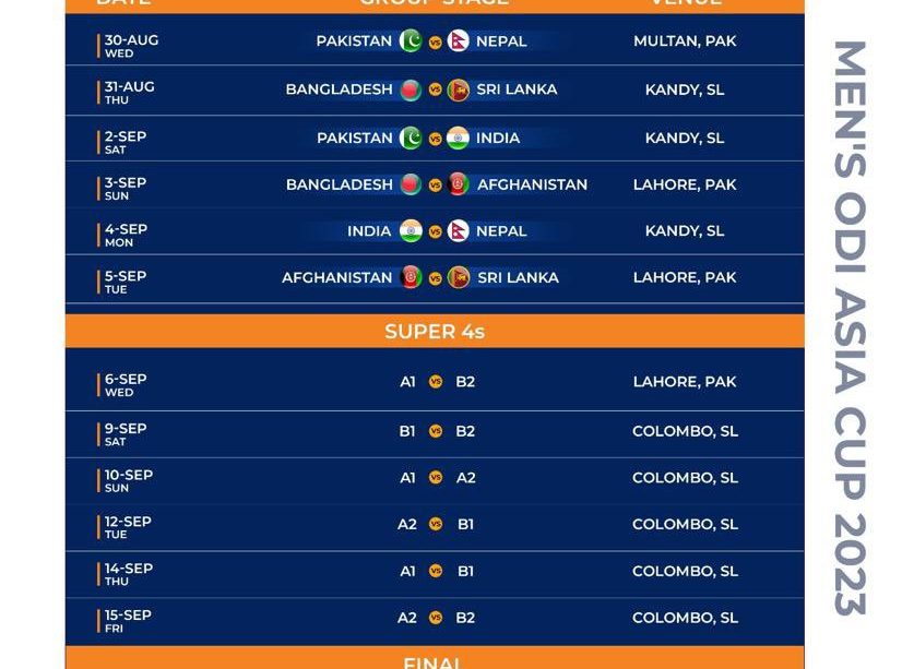 एशिया कप 2023 का आयोजन 30 अगस्त से 17 सितंबर के बीच किया जाएगा। यह प्रतियोगिता 50 ओवरों के प्रारूप में होगी और इसमें कुल 6 टीमें भाग लेंगी। यहाँ पर सभी मैचों का शेड्यूल दिया गया है: