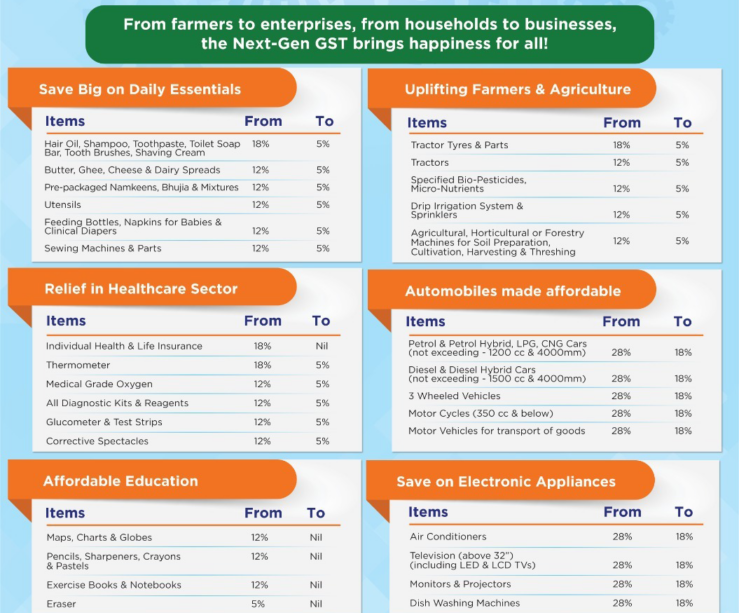 वित्त मंत्रालय द्वारा जारी की गई नई GST रेट्स लिस्ट में कई उत्पादों और सेवाओं के लिए कर दरों में परिवर्तन किया गया है। इनमें प्रमुख रूप से कुछ खाद्य वस्तुएं, इलेक्ट्रॉनिक्स और अन्य उपभोक्ता सामग्रियाँ शामिल हैं। नया ढांचा इस कोशिश का हिस्सा है कि महंगाई पर नियंत्रण रखा जा सके और भारत में कारोबार को बढ़ावा दिया जा सके।