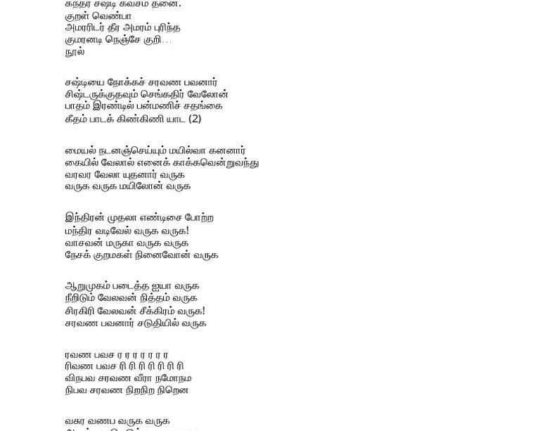 கந்த சஷ்டி கவசம் 6 அச்சங்களால் அமைந்துள்ளது, அதாவது தேவாதி சக்தி, ஆனந்த குமரன் மற்றும் வளர்ப்பு தெய்வமாகையால் ஆனது. மக்கள் இதை நாள்தோறும் பாடி, அவர்களை மூடுபனி மற்றும் கோதை வசந்தக்காலத்தில் இளைப்பாறுவார்கள். இந்த கவசம் பல்கலைக்கழகங்களால் ஆராய்ச்சி செய்யப்பட்டு, மதிப்பீட்டையும் பெற்றுள்ளது.