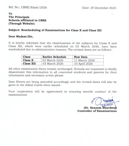 The board’s messages make two clear points: (1) exams scheduled for the specified date are postponed, and (2) fresh dates will be declared later. At this stage CBSE has not published the rescheduled dates or detailed instructions on admit cards, exam centres or seat allocation changes for affected candidates.