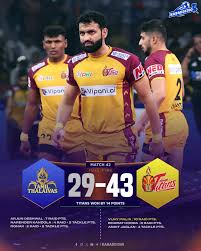This season, the Telugu Titans have been striving to improve their standings. The team is currently battling with consistency issues, having secured a mixed bag of wins and losses. As of the latest matches, they have managed to win only a few games, leaving them in the lower half of the points table. The performance of their star raider, Nilesh Salunke, and captain, Aasif Khan, will play a pivotal role in the remaining matches as the Titans aim to climb up the leaderboard.