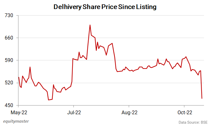 As of October 2023, Delhivery’s share price has shown fluctuations, reflecting broader market trends and company-specific developments. After an initial surge following its public listing in May 2022, the company has experienced volatility due to various market dynamics. Currently, the share price hovers around INR 550, influenced by quarterly results, the growth of e-commerce, and competitive pressures in the logistics sector.