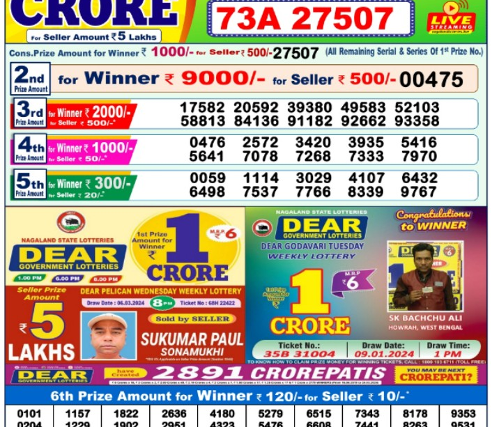 The latest draw of the Dear Lottery Sambad took place on October 27, 2023. The results are eagerly awaited by countless participants across the country, hoping to change their lives with a substantial cash prize. Check the official lottery website or trusted news sources to verify winning numbers ranging from the first prize to several consolation prizes. On this recent draw, the first prize winner took home ₹1 crore, with numerous other prizes awarded in differing amounts.