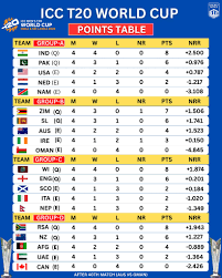 ICC T20 World Cup points table आम तौर पर हर ग्रुप के लिए अलग-अलग कॉलम दिखाती है: टीम का नाम, खेले गए मैच (P), जीते (W), हारे (L), बिना निर्णायक परिणाम/टाई (NR/ T), अंक (Pts) और नेट रन रेट (NRR)। अंक वितरण सामान्यतः इस प्रकार होता है: जीत पर 2 अंक, हार पर 0 अंक, और बिना परिणाम/रद्द मैच पर 1-1 अंक।