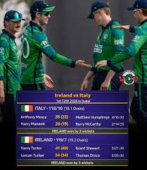 बीबीसी के अनुसार, आयरलैंड ने दुबई में हुए टी20 वार्म-अप में इटली को हराया। इटली ने पहले बल्लेबाज़ी करते हुए 118 रन बनाये और 18.1 ओवर में ऑल-आउट हुई। मोस्का ने 35 रन बनाए। आयरलैंड के गेंदबाजों में M. Humphreys ने 4-16 के प्रभावशाली आंकड़े दिखाए जबकि B. McCarthy ने 2-14 लिए। Humphreys के विकेटों में Grant Stewart, Marcus Campopiano और Jaspreet Singh शामिल थे, जिसमें Campopiano और Jaspreet Singh को 15वें ओवर में लगातार दो गेंदों पर आउट किया गया। Mark Adair ने Crishan Kalugamage का अंतिम विकेट लिया।