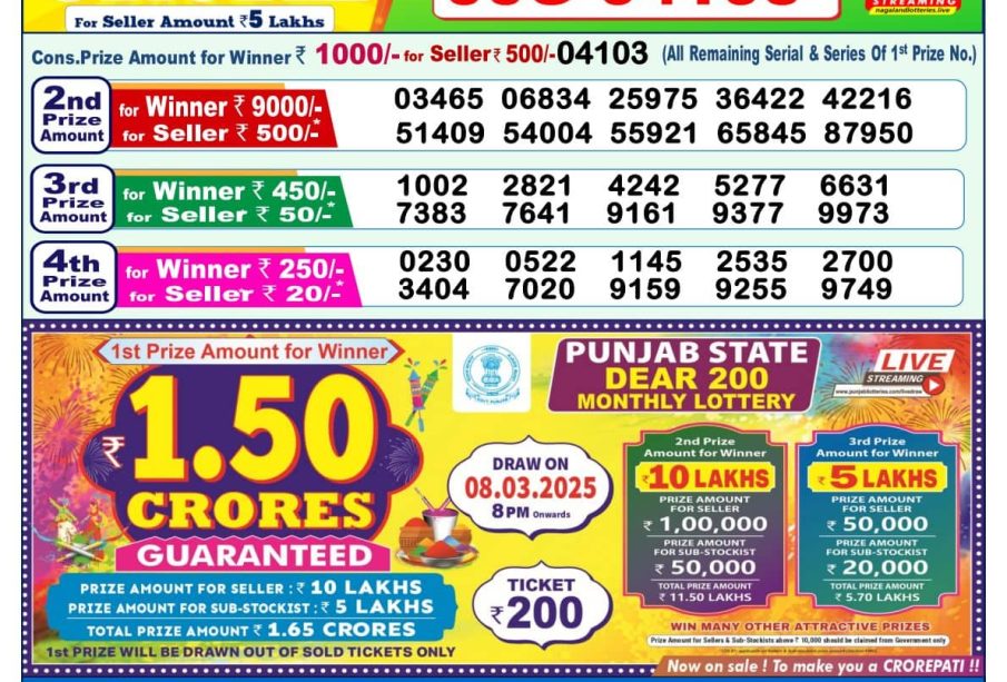 On October 10, 2023, the Nagaland State Lottery announced its weekly results, revealing the winning numbers for the ‘Dear Economy’ series. The draw took place at 8 PM, and participants across the state eagerly awaited the results to check if their tickets bore the winning numbers. According to sources, the first prize winner will receive ₹1 crore, while the second and third prizes amount to ₹9,000 and ₹4,500 respectively. Additionally, consolation prizes are awarded to several ticket holders, enhancing the excitement of participation.