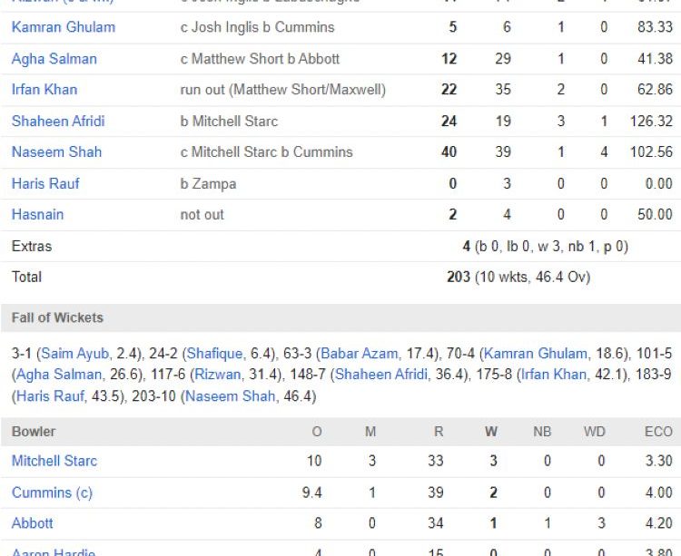 Pakistan national cricket team vs australian men’s cricket team मैच स्कोरकार्ड रिपोर्ट