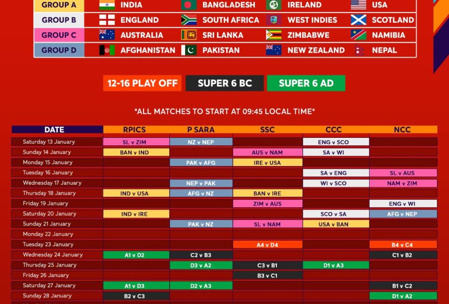 सूचना के मुताबिक भारत, जो अंडर-19 विश्व कप में सर्वाधिक पाँच बार विजेता रहा है, ग्रुप A में है जबकि ऑस्ट्रेलिया, चार बार की विजेता और मौजूदा चैंपियन, ग्रुप C में है। कुल 16 टीमों की भागीदारी के साथ ग्रुप-आधारित प्रारूप के बाद आगे की स्टेज होंगे।