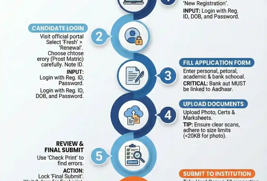 ऐसा कोई केंद्रीकृत विवरण जो केवल इसी स्रोत पर निर्भर हो, उपलब्ध नहीं है; इसलिए आवेदकें आधिकारिक पोर्टल और संस्थागत निर्देशों को प्राथमिकता दें। सामान्यतः छात्रवृत्ति प्रक्रिया में निम्नलिखित चरण होते हैं:
